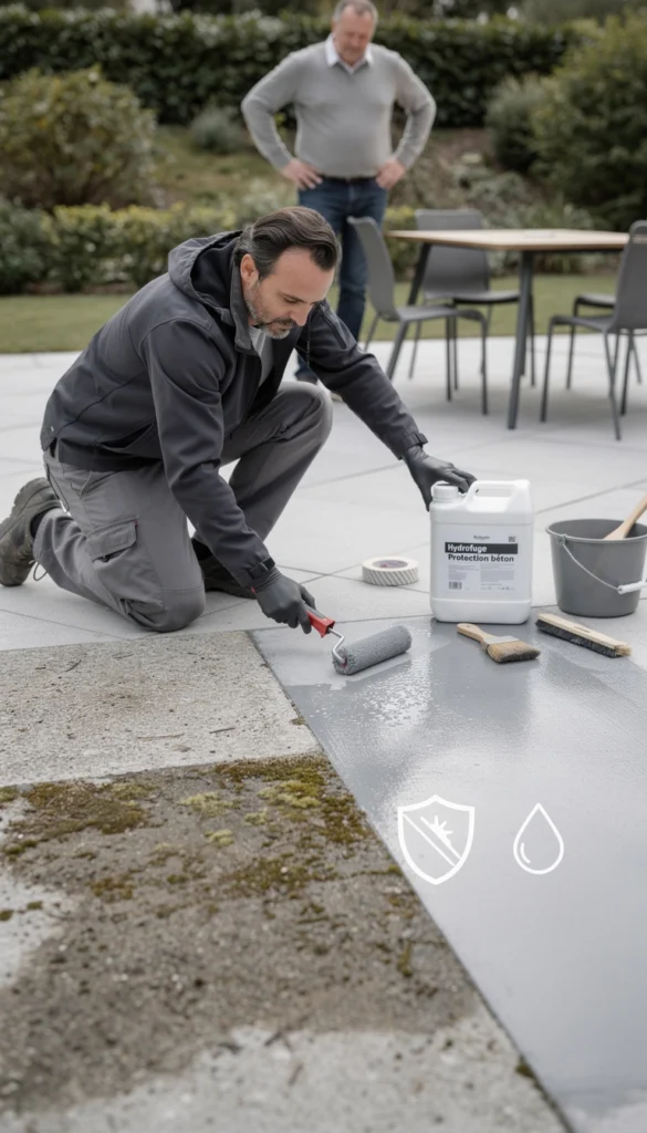 Les oléofuges protègent le béton contre les huiles et les graisses. Ils sont particulièrement recommandés pour les zones exposées, telles que les terrasses avec barbecue ou les cuisines extérieures. Ils fonctionnent en créant une barrière protectrice qui empêche l’huile de pénétrer dans le béton, facilitant ainsi le nettoyage et prévenant les taches permanentes.